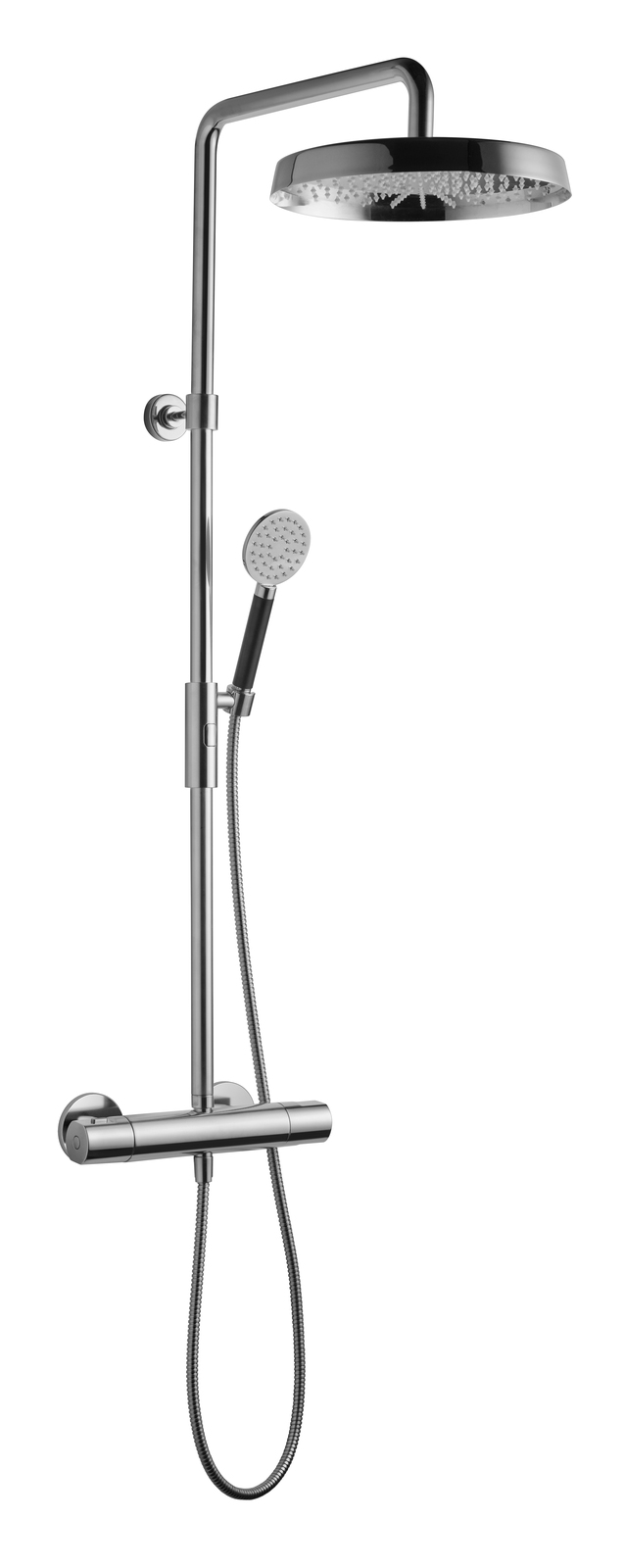 Takduschpaket med tryckbalanserad termostat och omkastare i vred. 160cc. Finns även i 150cc. Duschen går att kapa till önskad höjd. Kombineras med blandarfäste.